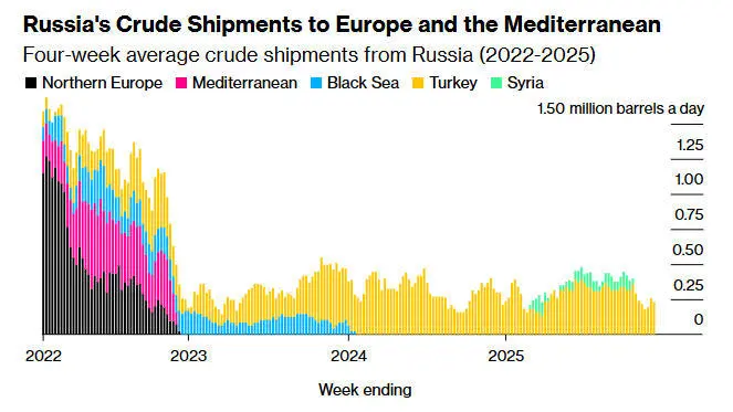 受制裁影响,俄罗斯能源出口大幅下降 彭博社制图