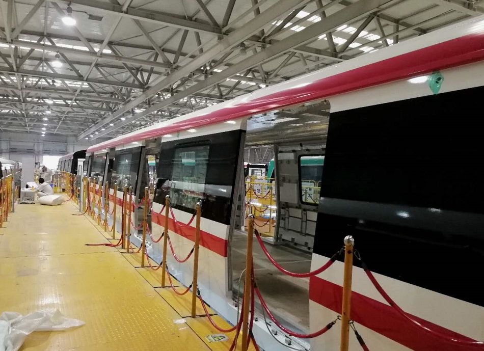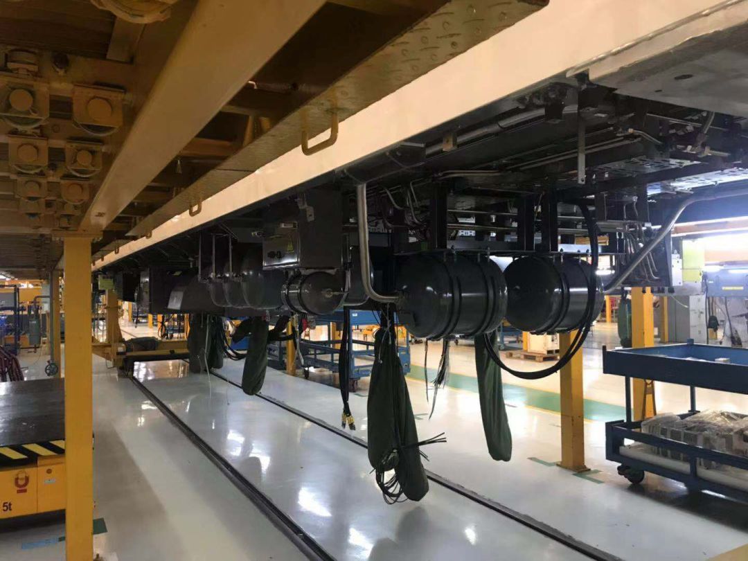 目前,6辆首列车均已进入总装阶段。车辆已完成客室车窗玻璃粘接、地板防寒材铺装及地板布粘接、车下管路及线槽敷设等工序,车顶空调安装、车内布线、机柜安装、底架设备安装等工序也正在有条不紊的进行中。首列车转向架构架制造已全部完成,并陆续开始总装。