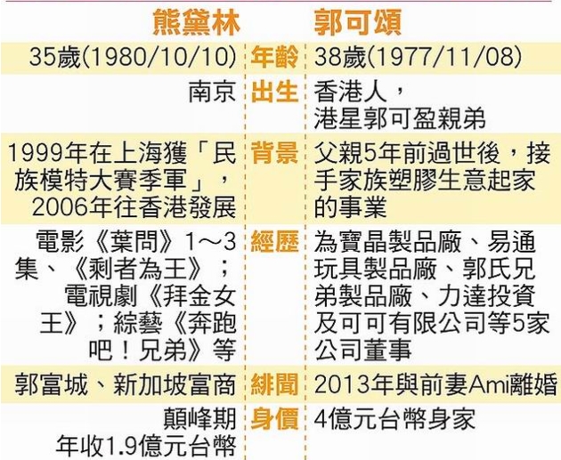 38岁的郭可颂继承父亲塑胶事业,虽离过婚,但经营家族事业有成,身兼5间公司董事,在香港曾拥9000万元台币豪宅,身价不菲。日前又在香港北角半山买下8300万元台币的豪宅,登记的是郭可颂和熊黛林2人共同名义,该豪宅位处高层,美丽海景尽收眼底。