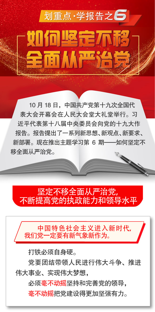 划重点·学报告:如何坚定不移全面从严治党 2017-11-17 相关链接: 划重点·学报告之5:如何开启全面建设社会主义现代化国家新征程? 划重点·学报告之4:新时代中国特色社会主义的基本方略是什么? 划重点•学报告之3、2、1