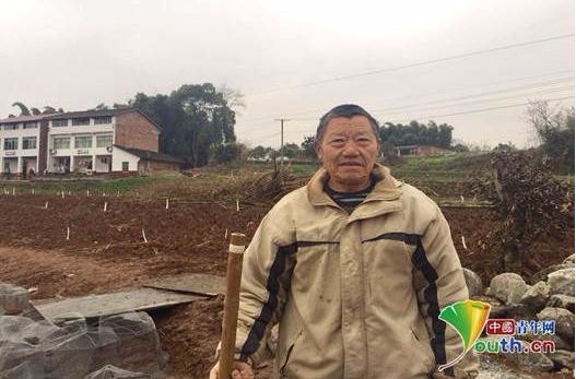 黄世明正在桥头上夯土 背后是一片刚整理出来用于建房子的空地。隆敏摄