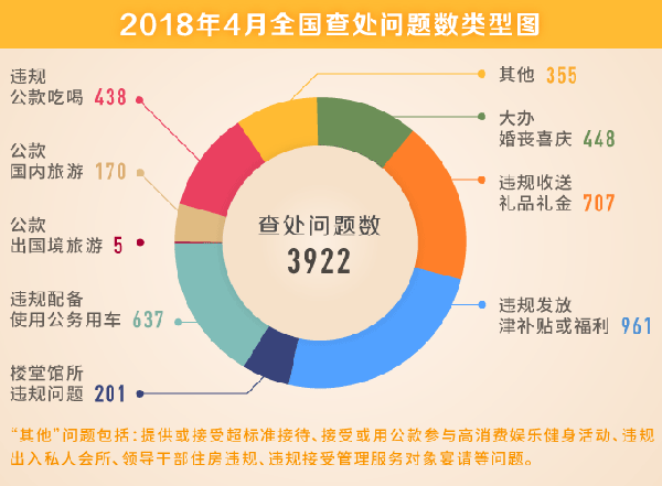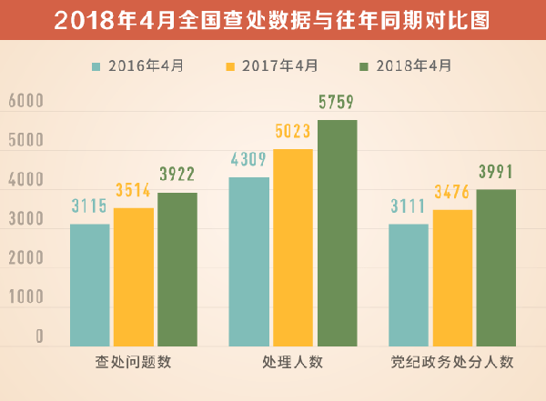 5月24日,中央纪委国家监委网站发布2018年4月份月报数据,2018年4月全国共查处违反中央八项规定精神问题3922起,处理党员干部5759人,给予党纪政务处分3991人。其中,乡科级及以下3500余人、县处级370余人、地厅级50余人。