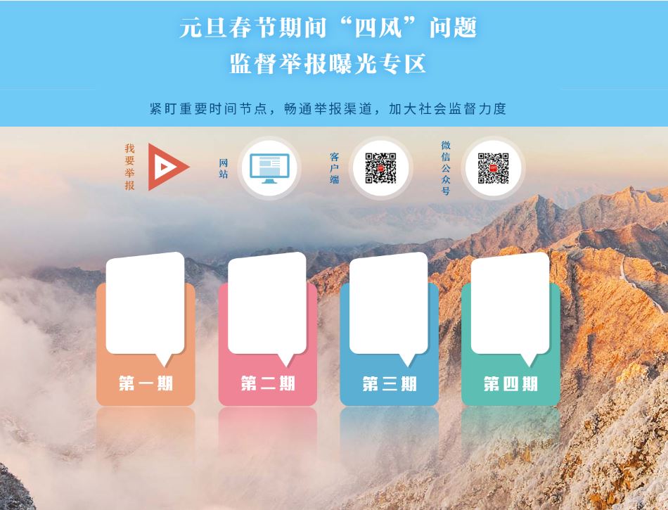 2019年元旦、春节将至,为切实抓好节日期间落实中央八项规定及其实施细则精神、纠正“四风”工作,营造风清气正节日氛围,中央纪委国家监委网站推出“元旦春节期间‘四风’问题监督举报曝光专区”,畅通监督举报渠道,加大典型案例通报曝光力度,增强警示震慑和教育引导作用。