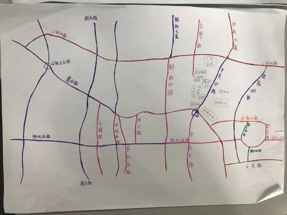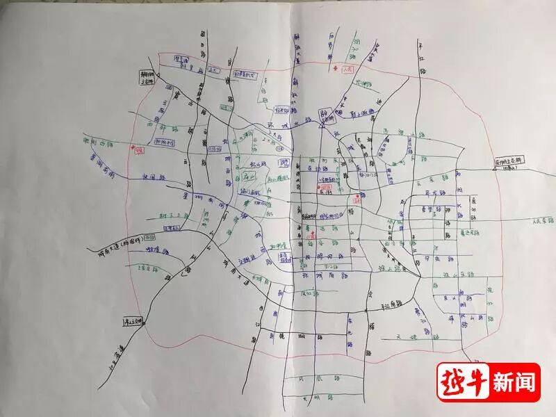 “当某个地方不清楚时,我会专门去实地看看,有时步行,有时骑车。”阮杨琳举例说,为了搞清楚香炉峰到银泰城的线路,她选择了步行,边走边将沿路的地名标注在手绘地图上。“如果不实地查看,你就不知道路的尽头在哪,起端又在哪,不知道哪里要拐弯,这要靠自己一步步走出来。”她笑着说,记地形要由点及面,先记大路,再记小路,碰到陌生地点,就要以这个地点为中心,熟悉周围的大街小巷、犄角旮旯。