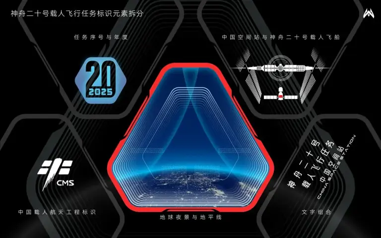 标识的主要元素由地球、中国空间站以及神舟二十号载人飞船组成,以“精准”、“纵深”与“聚焦”作为设计主题将这些元素通过大透视及渐变重新构成,整体呈现更强烈的视觉层次,模拟一种通过舷窗望向外部空间的视觉感受。