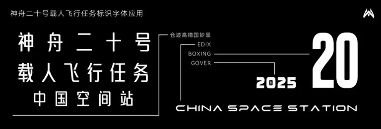 神舟二十号载人飞行任务标识选用了四种字体。这些字体的使用主要为了凸显出以“科幻”与“梦想”为关键词的设计理念,通过调整字体间距来满足构成需求,并与整体视觉风格相契合。