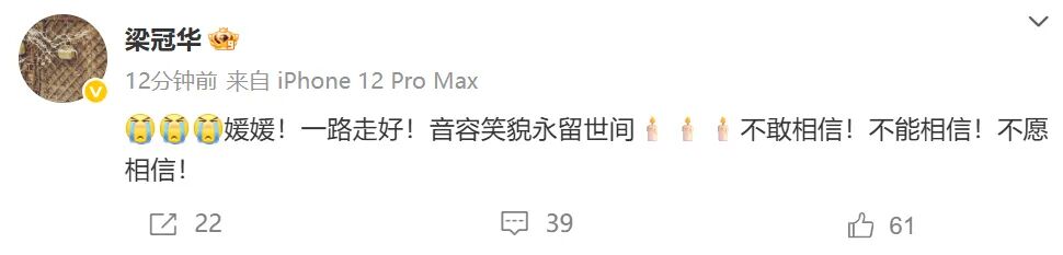 梁冠华:“媛媛!一路走好!音容笑貌永留世间。不敢相信!不能相信!不愿相信!”