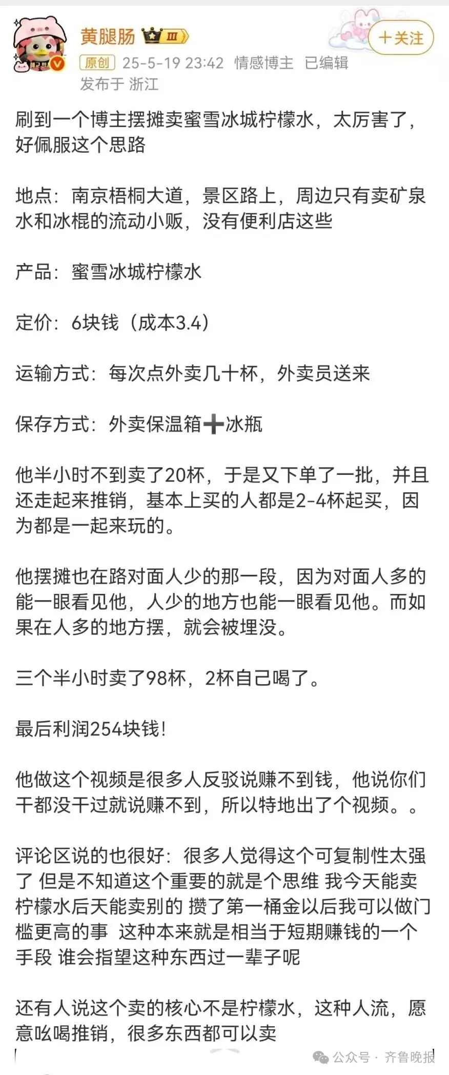 发布者“黄腿肠”称,在南京梧桐大道景区,周边仅有售卖矿泉水和冰棍的流动小贩,没有便利店,一位博主发现商机,通过外卖一次性订购数十杯蜜雪冰城柠檬水,利用外卖保温箱搭配冰瓶进行保存,在景区道路对面人少却显眼的位置摆摊售卖。该博主将原价4元的柠檬水定价为6元出售,半小时便售出20杯,随后又下单补货。三个半小时内,该博主累计卖出98杯(含自饮2杯),最终获利254元。