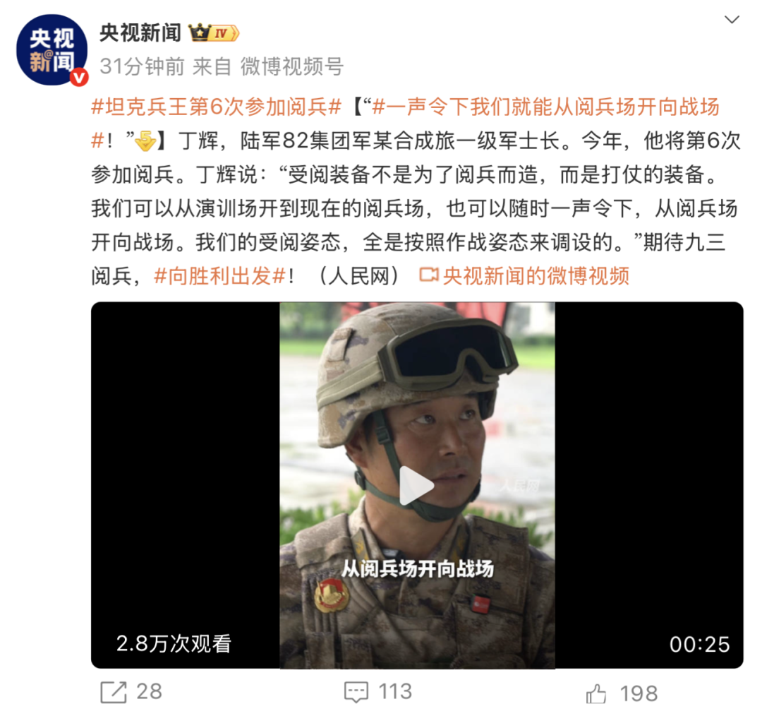 据人民网报道,陆军82集团军某合成旅一级军士长丁辉,曾5次参加阅兵,4次驾驶坦克方队头车,今年他将第6次参加阅兵。