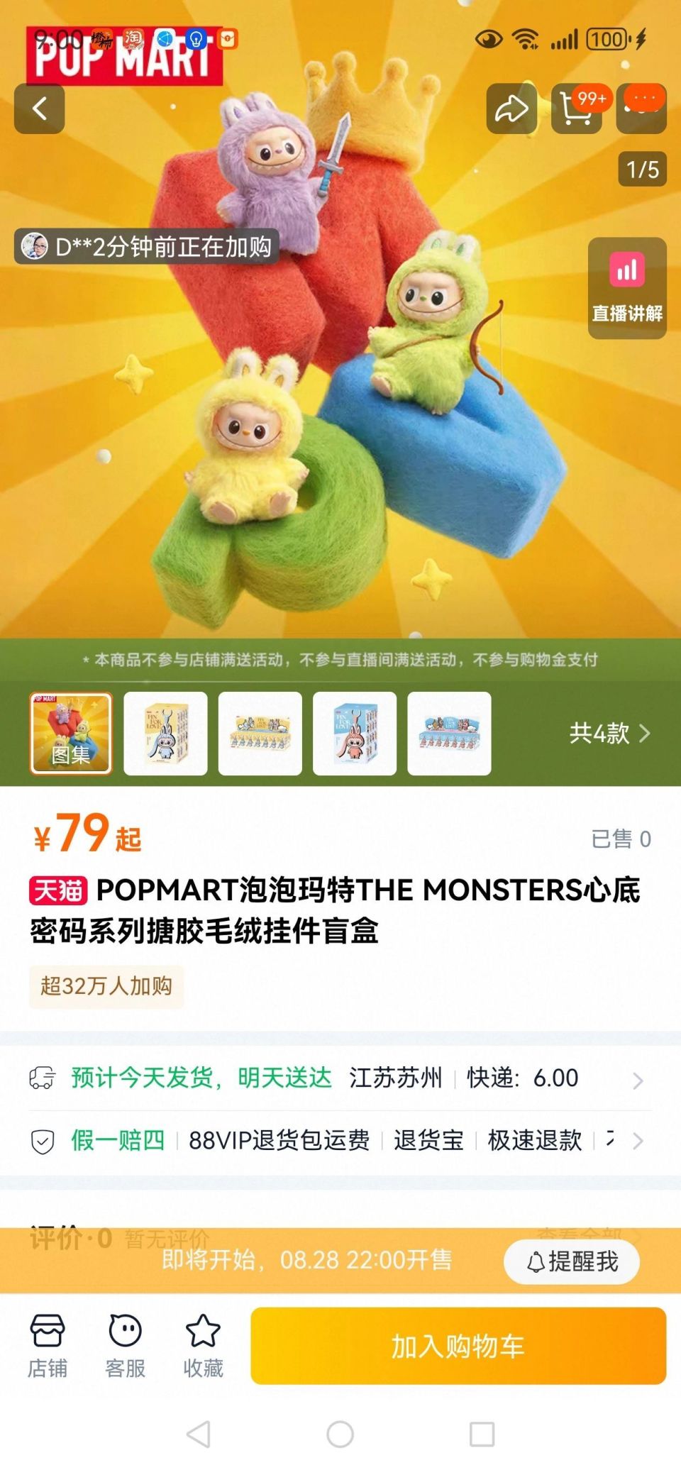 橙柿互动记者查询,泡泡玛特官方旗舰店将在8月28日推出新款Labubu搪胶毛绒挂件盲盒,价值79元,目前暂未发售。