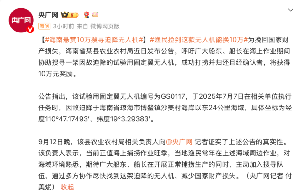 公告指出,该试验用固定翼无人机编号为GS0117,于2025年7月7日在相关单位执行任务时,因故迫降于海南省琼海市博鳌镇沙美村海岸以东24公里海域,具体坐标为经度110°47.17493′、纬度19°3.29383′。