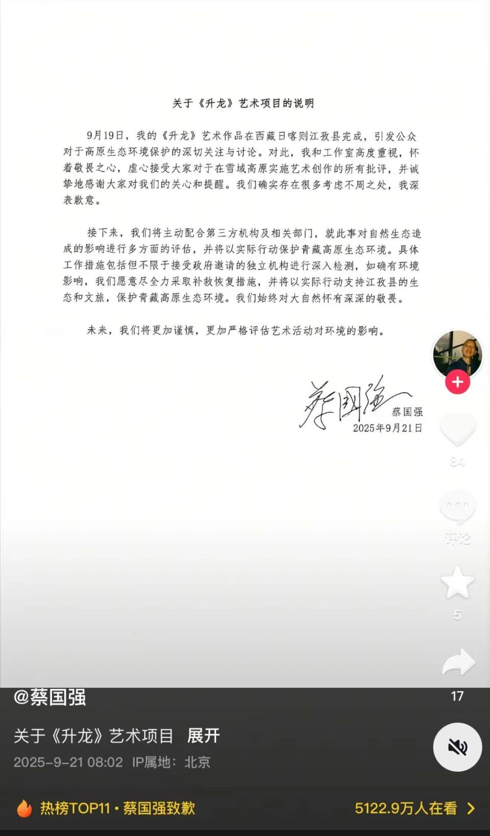 刚刚,蔡国强在社交平台发布致歉信,全文如下: