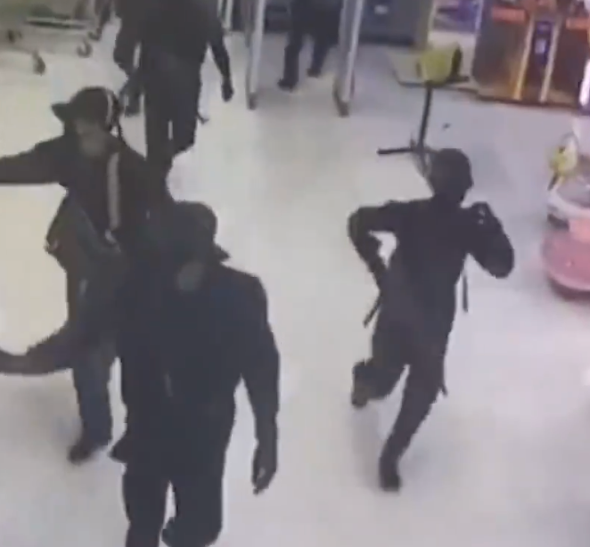 嫌犯分乘两辆皮卡车抵达商场,其中部分人留守车内,另一部分人持械闯入商场,制服保安后直奔金店实施抢劫。嫌犯分乘两辆皮卡车抵达商场,其中部分人留守车内,另一部分人持械闯入商场,制服保安后直奔金店实施抢劫。