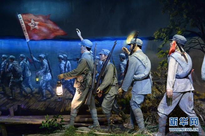 这是江西省于都县中央红军长征出发纪念馆内展示的红军夜渡于都河的场景(8月11日摄)。